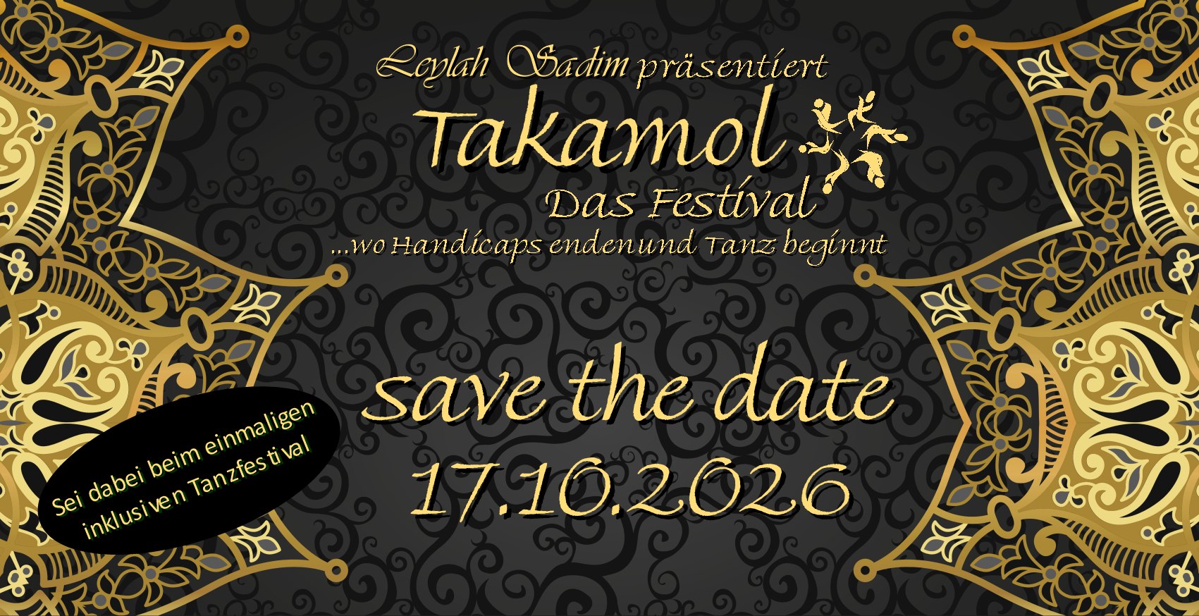 TAKAMOL - DAS FESTIVAL ist das 1. Inklusive Tanzfestival seiner Art und soll Menschen mit und ohne Handicap im Tanz und auf einer Bühne unter dem Motto „wo Handicaps enden und Tanz beginnt“ vereinen. Ein solches Festival voller getanzter und gelebter Inklusion gab es bisher noch nie – es soll stetig wachsen, nicht nur an Größe und Bekanntheit, sondern auch an Vielfältigkeit der Menschen, die zusammenkommen. Wir tanzen und leben Inklusion im Rahmen dieses Festivals in Form eines harmonischen, wertschätzenden und bedachten Miteinander auf Augenhöhe zwischen allen Beteiligten auf, neben und hinter der Bühne ungeachtet ihrer Herkunft, ihrer sexuellen Orientierung, ihres Aussehens, ihrer Handicaps usw. Ein Festival wie Takamol lebt durch das Engagement und Herzblut der Menschen, die es gemeinsam gestalten, sowie durch die Wertschätzung der BesucherInnen. Mehr Inklusion geht nicht!!! Und du kannst mit dabei sein!!!